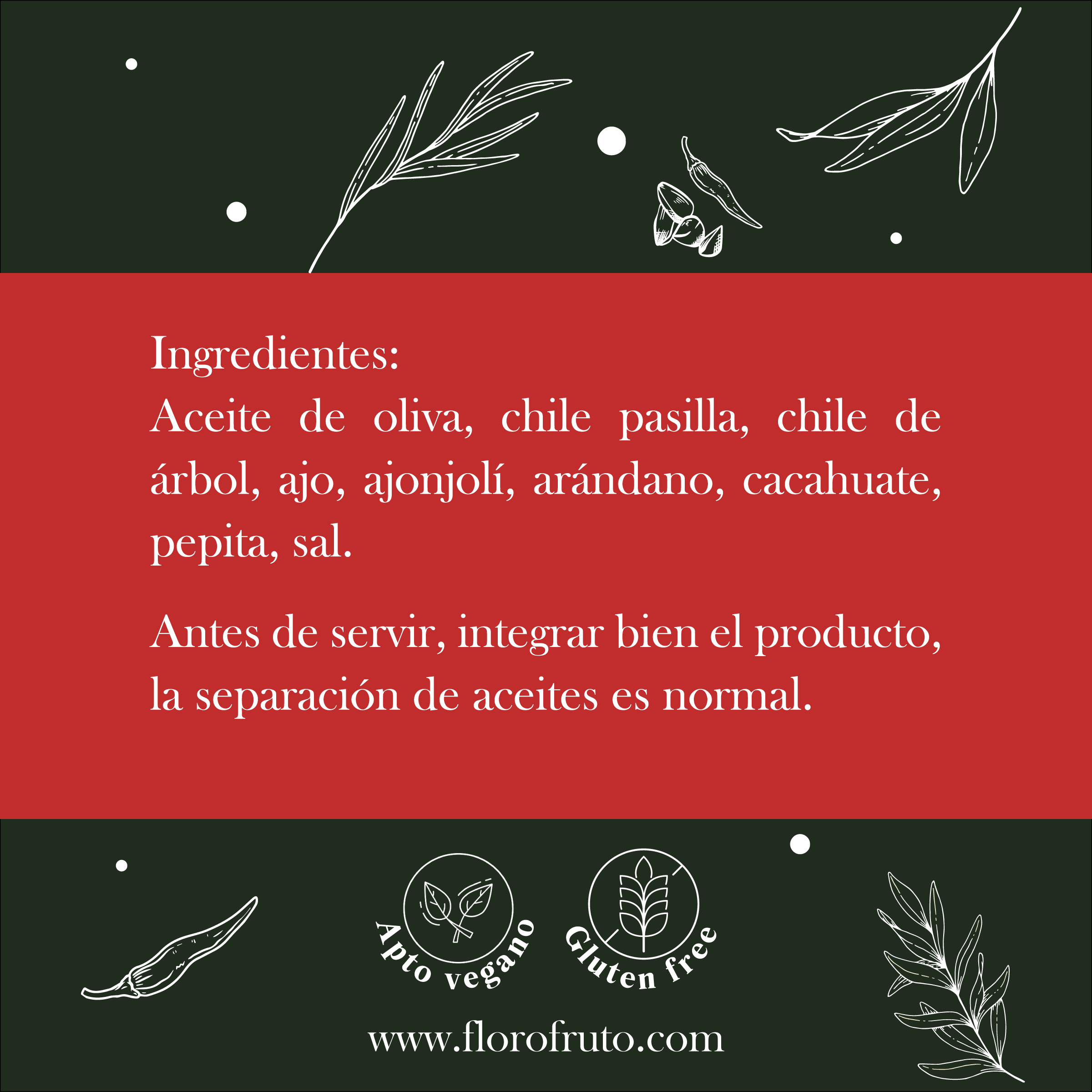 Ingredientes: aceite de oliva, chile pasilla, chile de árbol, arándano, ajo, sal de mar y ajonjolí.