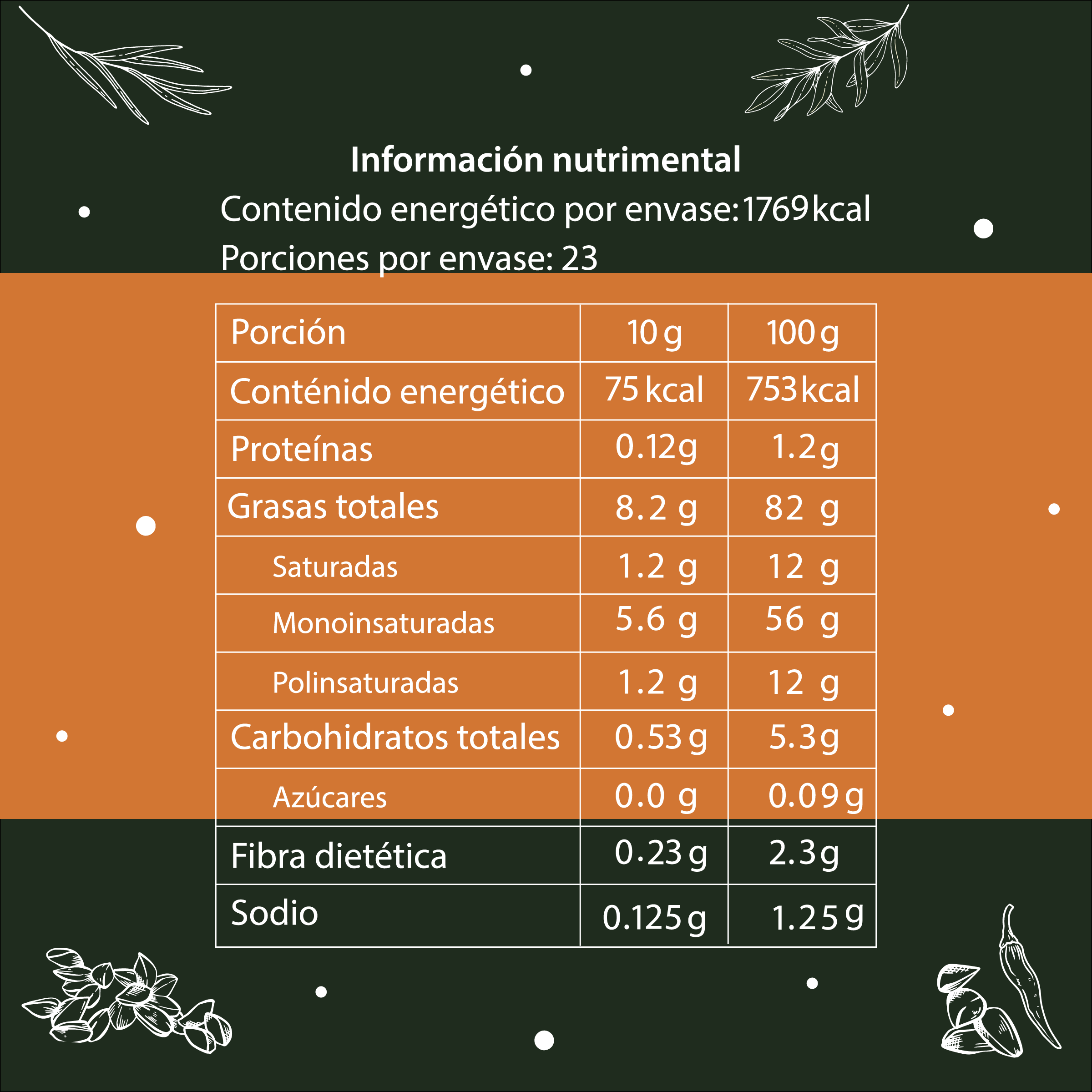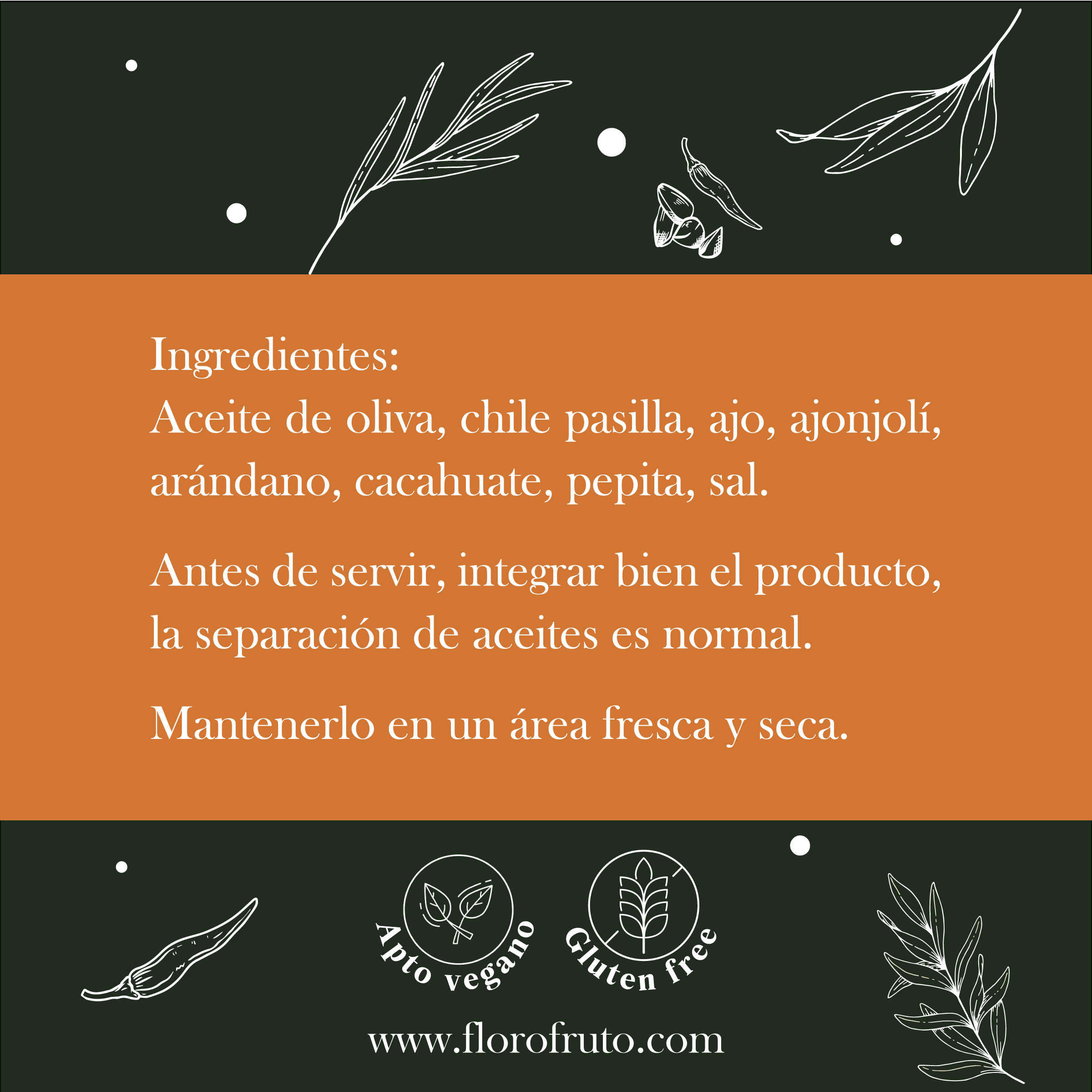 Ingredientes: Aceite de oliva, chile pasilla, arándano, ajo, sal de mar y ajonjolí.